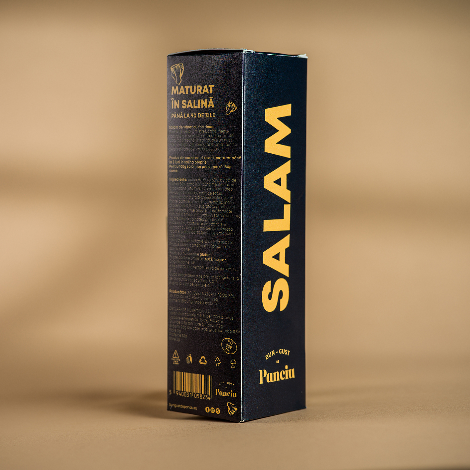 Procesul de maturare lentă și naturală are loc în salina noastră artizanală din Panciu, unde salamul dobândește acel echilibru unic dintre caracterul sălbatic și eleganța gastronomică. Rețeta noastră folosește doar ingrediente curate, fără nitriți sau conservanți artificiali. Gustul final? Intens, elegant și imposibil de uitat.