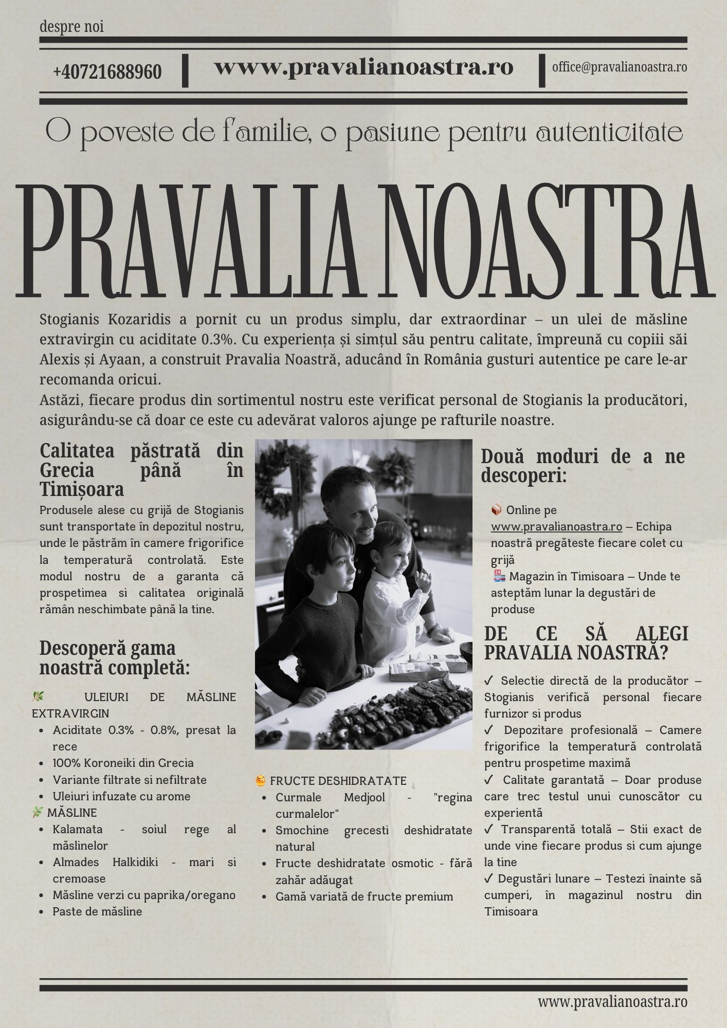 Produsele ce călătoresc spre Prăvălie sunt rodite de pământ grecesc, mângâiate și dezmierdate de razele soarelui mediteranean sau culese de prin colțuri binecuvântate ale lumii, acolo unde natura se simte în largul ei, devine generoasă și întinde plantații vaste de măslini, curmale, fistic, migdali sau smochini.