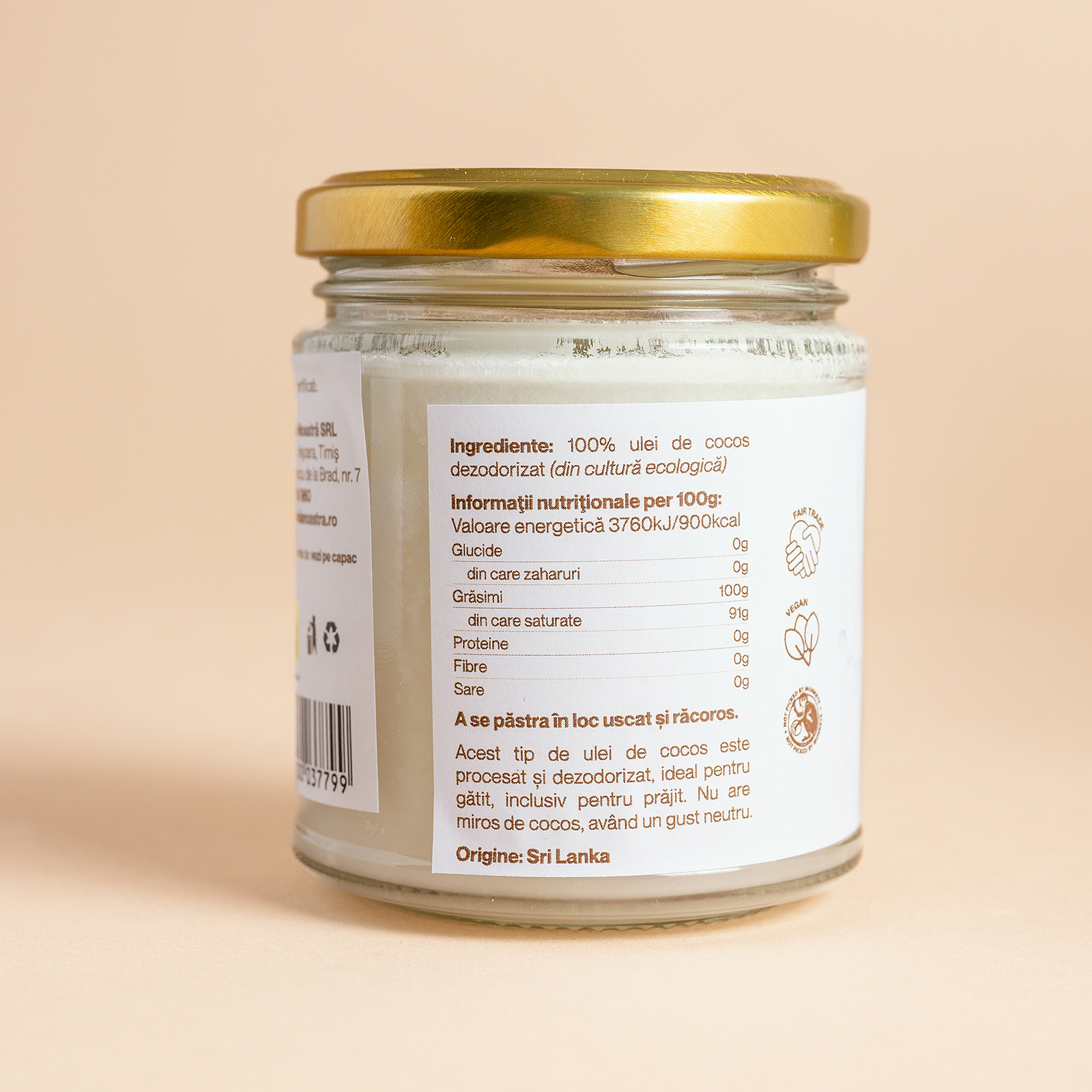 Uleiul de cocos dezodorizat provine din nuci de cocos cultivate organic, fără pesticide sau fertilizanți chimici. Procesul de prelucrare este complet mecanic și ecologic, asigurând păstrarea proprietăților naturale ale produsului.