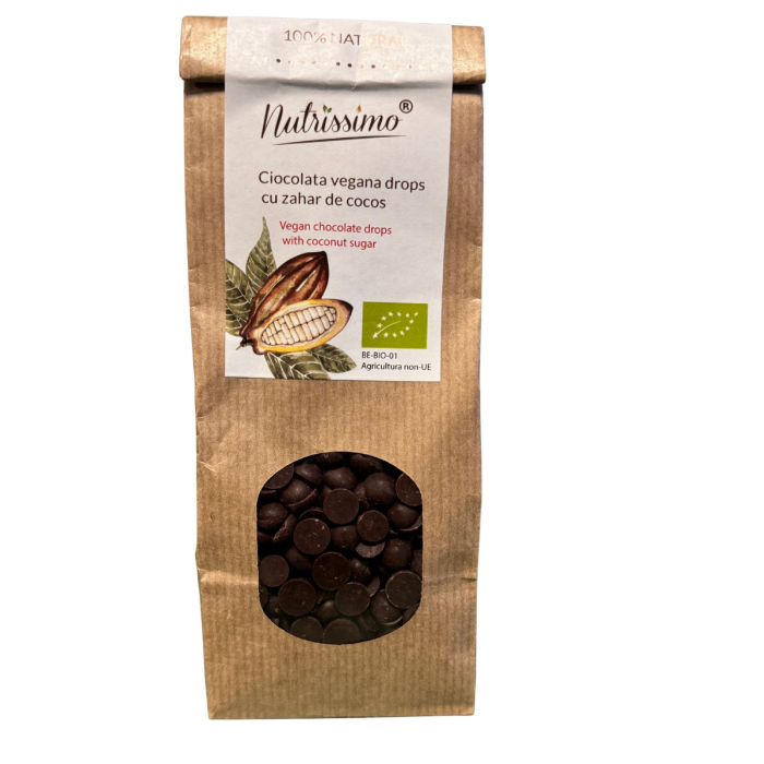 Drops de ciocolată ecologice obținute din masă de cacao și unt de cacao ECO, îndulcite cu zahăr din flori de cocos.