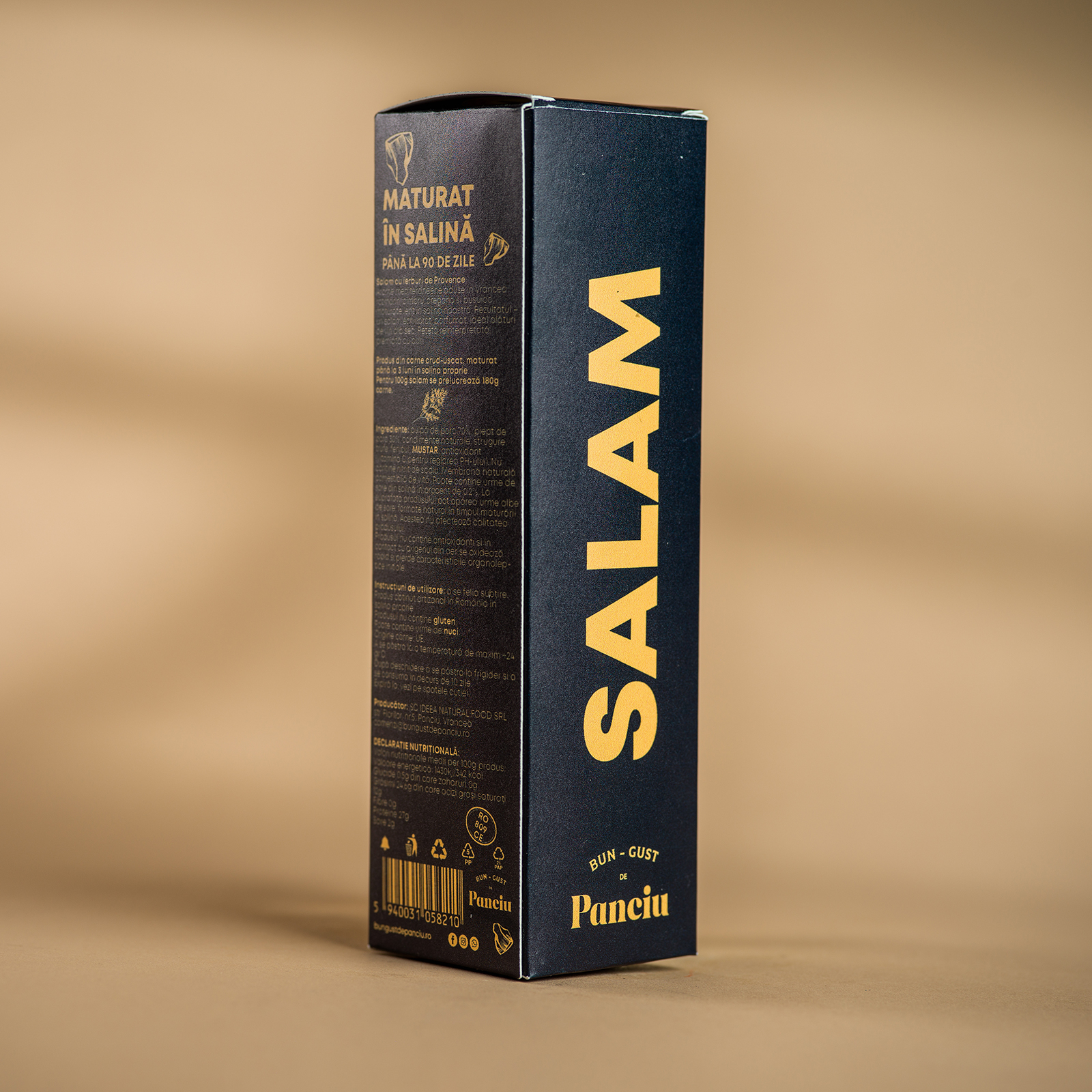 Aromele sudului Franței ajung în Vrancea, la Panciu, prin acest salam condimentat cu ierburi de Provence – rozmarin, cimbru, oregano și busuioc. Carnea de porc se maturează cu răbdare în salina noastră artizanală, unde timpul lucrează ca un meșter, adăugând profunzime și echilibru.